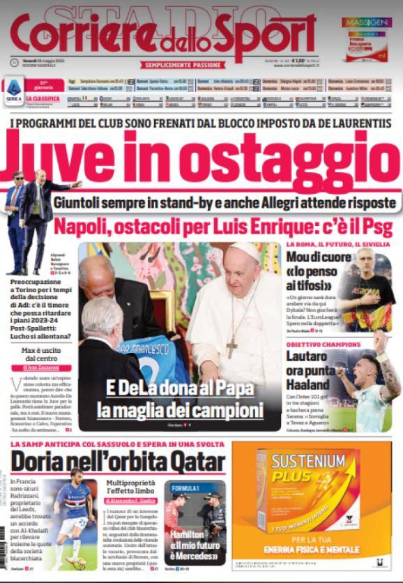"Juve in ostaggio", titola l'edizione odierna del Corriere dello Sport. E poi ancora: "Giuntoli sempre in stand-by e anche Allegri attende risposte". Sul Napoli spazio all'udienza di De Laurentiis dal Papa: "E DeLa dona al Papa la maglia dei campioni". Ma si parla anche della questione allenatore: "Ostacoli per Luis Enrique: c'è il Psg".