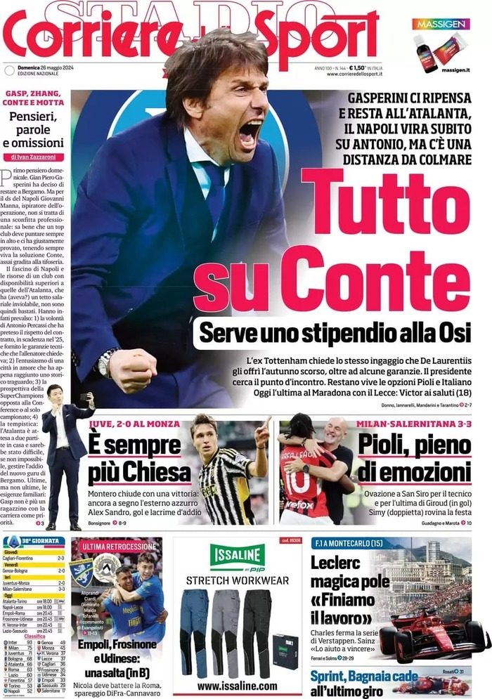 "Tutto su Conte", titola l'edizione odierna del Corriere dello Sport in merito alla volontà del Napoli di puntare sul tecnico salentino. Ma serve uno stipendio molto alto.
