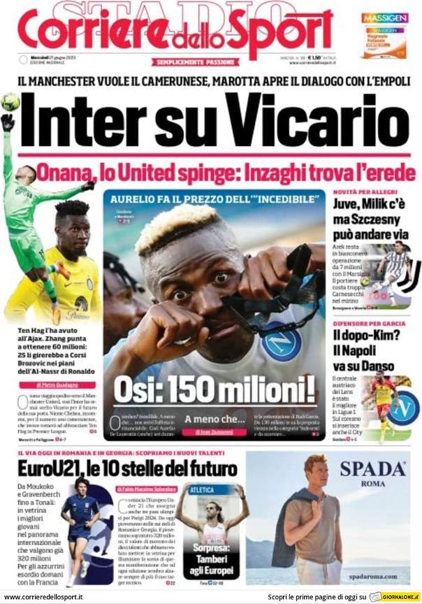 Sono tanti gli spunti che arrivano dalla prima pagina del Corriere dello Sport. Il noto quotidiano si sofferma su alcuni degli argomenti più caldi del momento. Ecco alcuni titoli dell'ultima edizione: "Osi: 150 milioni. Aurelio fa il prezzo dell'incedibile".