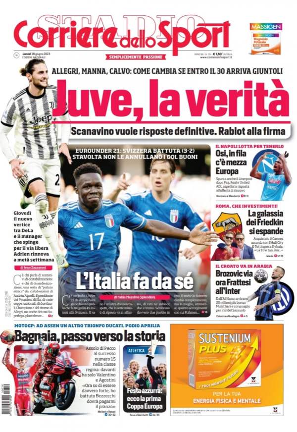 La prima pagina del noto quotidiano si sofferma sui temi più caldi del momento relativi al calcio italiano e non solo.