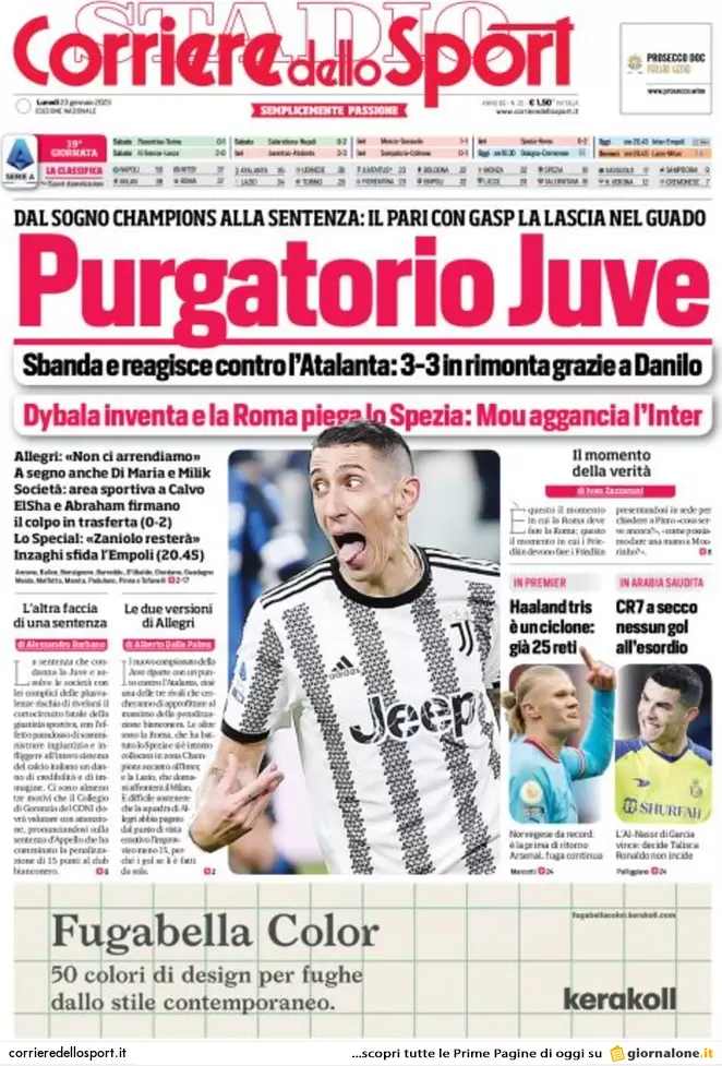 Sono tanti gli spunti che arrivano dalla prima pagina del Corriere dello Sport. Il noto quotidiano si sofferma su alcuni degli argomenti più caldi del momento. Ecco alcuni titoli dell'ultima edizione: "Purgatorio Juve, sbanda e reagisce contro l'Atalanta: 3.3 in rimonta grazie a Danilo. Dal sogno Champions alla sentenza: il pari con Gasp la lascia nel guado".