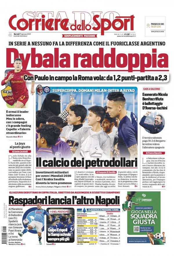 "Dybala raddoppia", l'effetto Dybala si fa sentire per la Roma: con lui in campo raddoppia la media punti. Apre così l'edizione odierna del Corriere dello Sport, che dà spazio anche alla Supercoppa tra Milan e Inter. In taglio basso, c'è posto anche per Coppa Italia, con il Napoli impegnato contro la Cremonese: "Raspadori lancia l'altro Napoli".