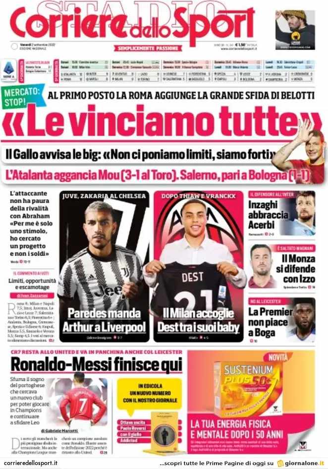 Sono tanti gli spunti che arrivano dalla prima pagina del Corriere dello Sport. Il noto quotidiano si sofferma su alcuni degli argomenti più caldi del momento. Ecco alcuni titoli dell'ultima edizione: "Ronaldo-Messi, finisce qui. Sfuma il sogno del portoghese che cercava un nuovo club per poter giocare in Champions e e continuare a sfidare Leo".