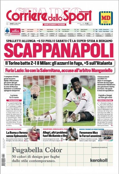 PRIMA PAGINA CORRIERE - ScappaNapoli. Spalletti allunga: +6 su Pioli