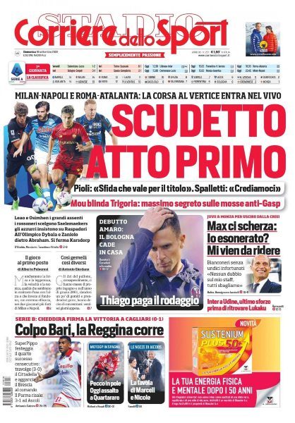 Sono tanti gli spunti che arrivano dalla prima pagina del Corriere dello Sport. Il noto quotidiano si sofferma su alcuni degli argomenti più caldi del momento. Ecco alcuni titoli dell'ultima edizione: "Scudetto, atto primo. Milan-Napoli e Roma-Atalanta: la corsa al vertice entra nel vivo. Pioli: sfida ce vale per il titolo. Spalletti: crediamoci".