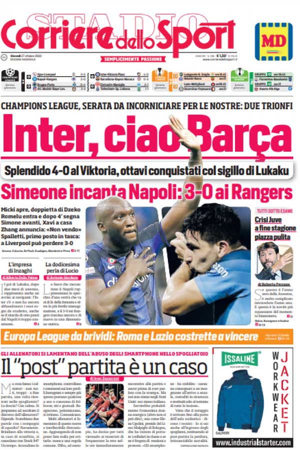 La prima pagina dell'edizione Corriere dello Sport celebra le italiane in Champions League: dalla vittoria dell'Inter a quella del Napoli. In prima pagina anche il pre partita delle due romane in Europa League