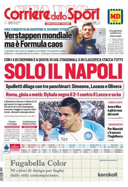 Sono tanti gli spunti che arrivano dalla prima pagina del Corriere dello Sport. Il noto quotidiano si sofferma su alcuni degli argomenti più caldi del momento. Ecco alcuni titoli dell'ultima edizione: "Solo il Napoli. Spalletti dilaga con tre panchinari: Simeone, Lozano e Olivera. Con i 4 di Cremona è a quota 35 gol stagionali. E in classifica stacca tutti".