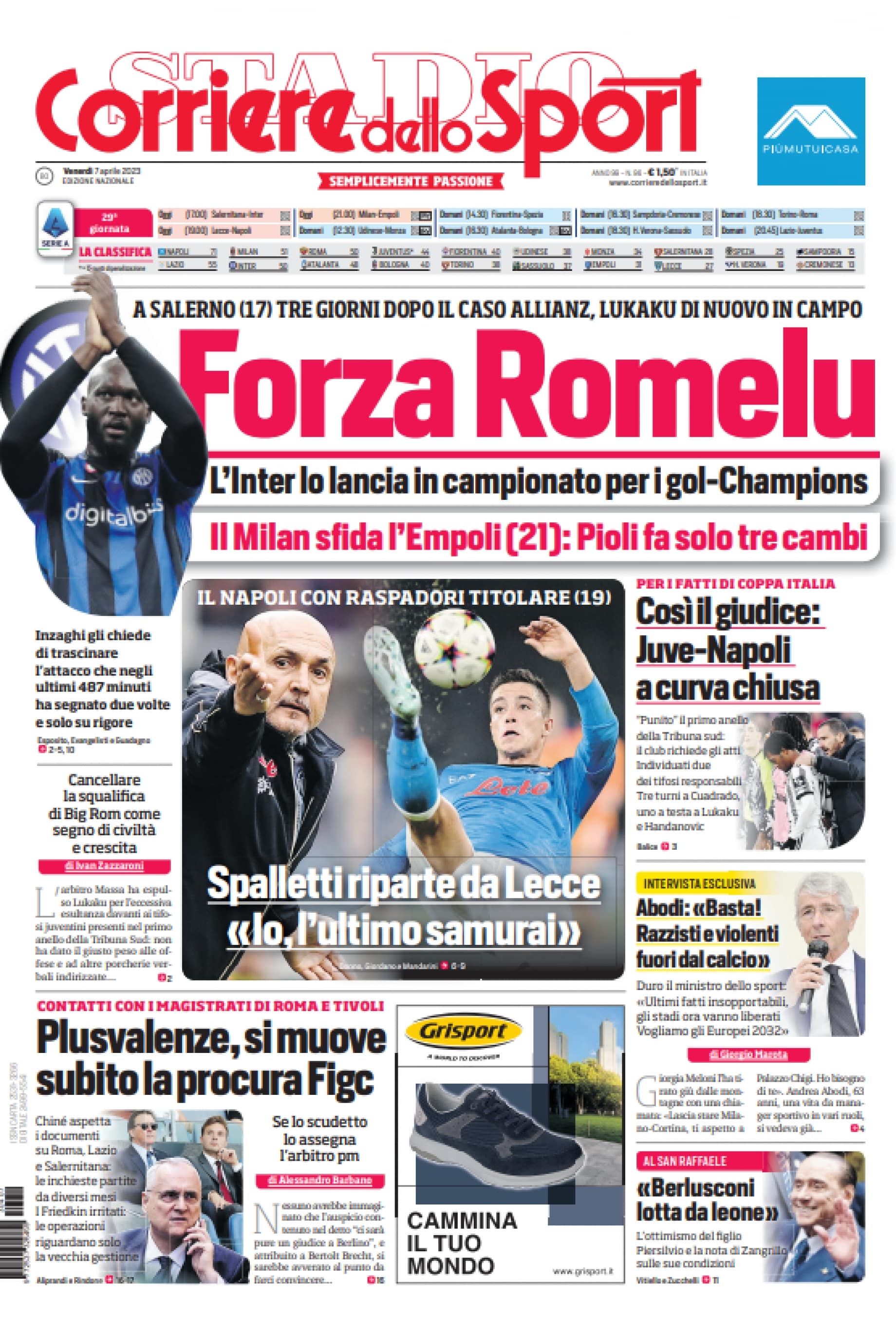 Sono tanti gli spunti che arrivano dalla prima pagina del Corriere dello Sport. Il noto quotidiano si sofferma su alcuni degli argomenti più caldi del momento. Ecco alcuni titoli dell'ultima edizione: "Spalletti riparte da Lecce: io, l'ultimo samurai. Il Napoli con Raspadori titolare". E ancora: "Così il giudice: Juve-Napoli e curva chiusa".