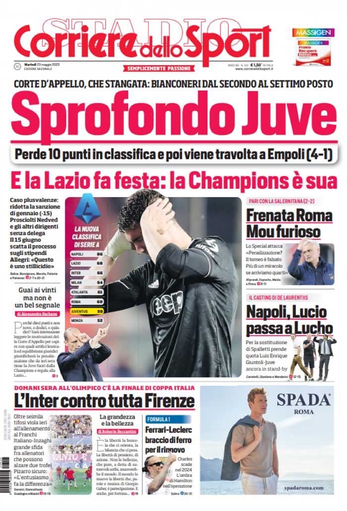 "Sprofondo Juve" è il titolo scelto per la prima pagina dell'edizione odierna del Corriere dello Sport. Sulla destra spazio a Roma e Napoli. Per quanto riguarda gli azzurri si legge: "Napoli, Lucio passa a Lucho", il riferimento è a Luis Enrique.