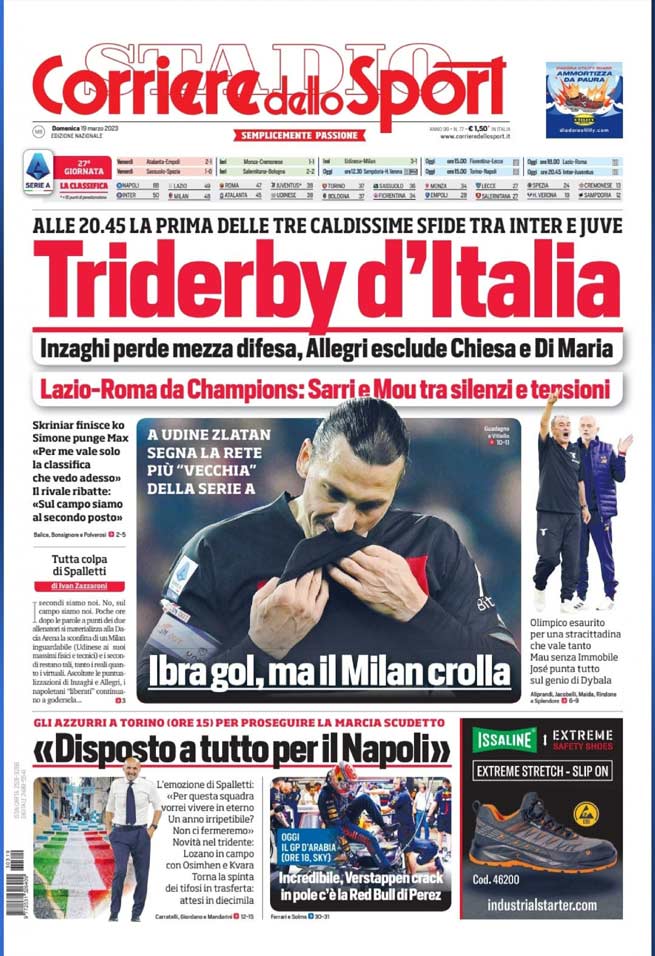 "Triderby d'Italia", titola cosi il Corriere dello Sport. Nella prima pagina spazio al derby d'Italia tra Inter e Juventus e al derby Lazio-Roma. Ibra fa il record ma il Milan "crolla". Spalletti, poi, disposto a "tutto per il suo Napoli".
