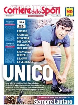 "UNICO, è morto Gigi Riva", titola l'edizione odierna del Corriere dello Sport in merito alla morte di Gigi Riva. "Sempre Lautaro, Napoli battuto", in merito alla Supercoppa Italiana.