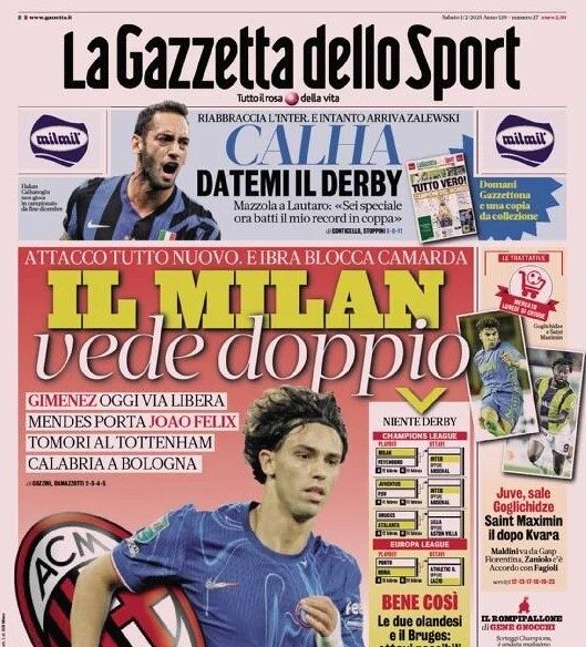 La Gazzetta dello Sport, edizione del primo febbraio 2025, tra poche ore in edicola, fa il punto sul Milan, che è vicino a Gimenez e Joao Felix, mentre Tomori andrà al Tottenham e Calabria al Bologna.