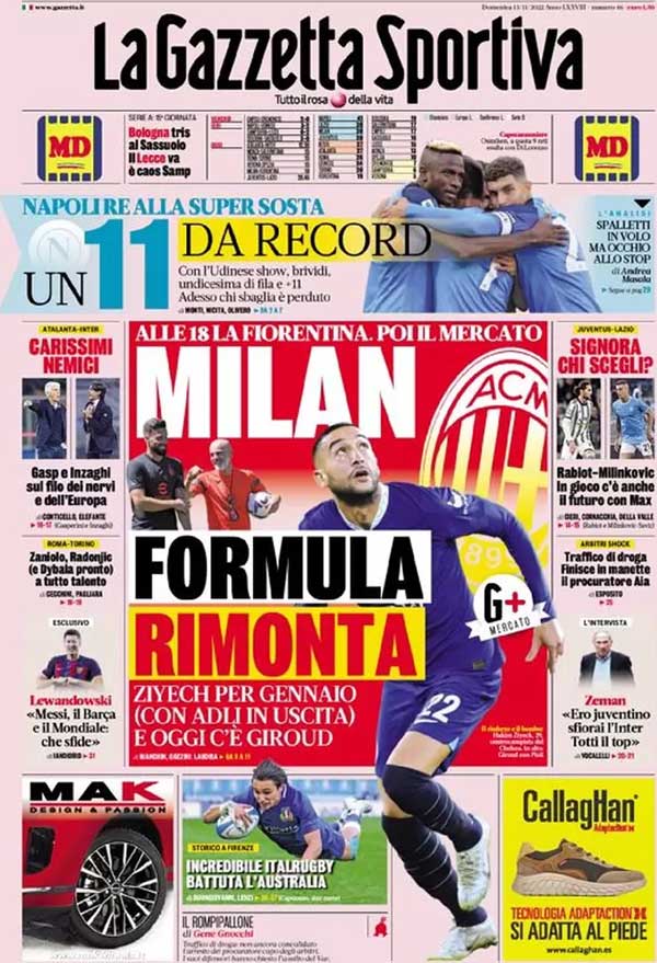 "Napoli Re alla super sosta. Un 11 da record", titola l'edizione odierna della Gazzetta dello Sport in merito alla vittoria del Napoli contro l'Udinese. Poi spazio alle altre squadre: "Milan formula rimonta".
