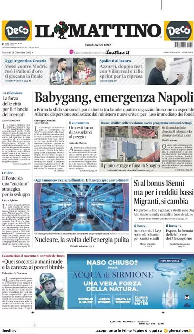 "Azzurri, doppio test con Villarreal e Lille. Sprint per la ripresa", titola l'edizione odierna de Il Mattino in merito alle prossime due amichevoli del Napoli. Spalletti al lavoro. Spazio anche ai Mondiali: "Oggi Argentina-Croazia. Messi contro Modric".