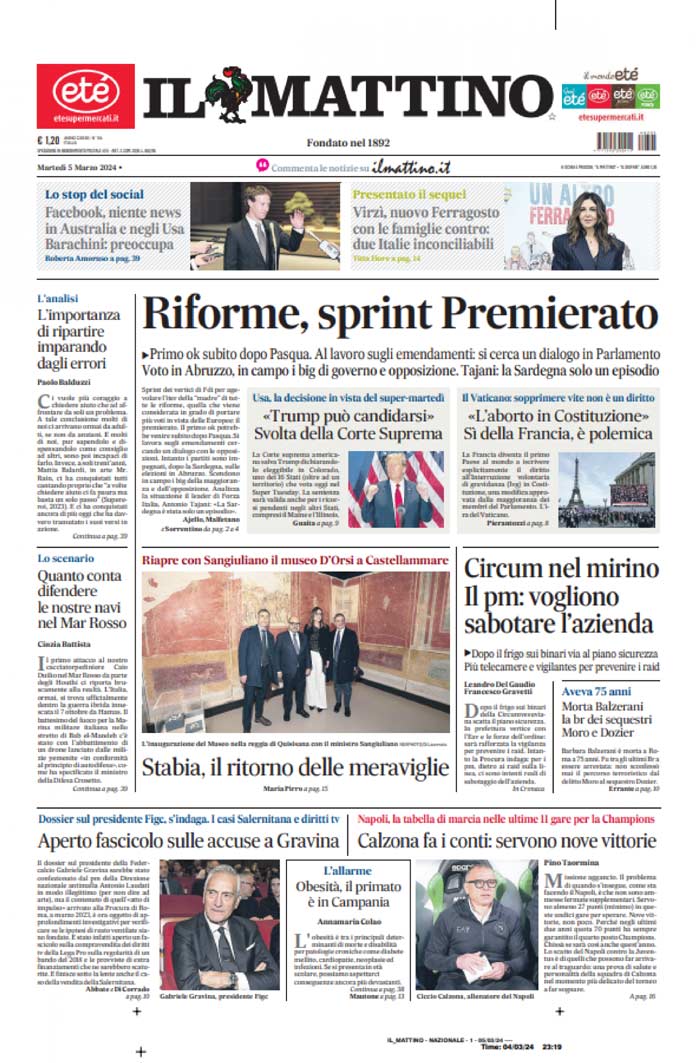 Nella parte bassa della prima pagina, Il Mattino scrive di un fascicolo aperto sulle accuse a Gabriele Gravina, presidente della FIGC, e del numero di vittorie necessarie al Napoli per qualificarsi alla prossima Champions League: "Calzona fa i conti, servono nove vittorie".