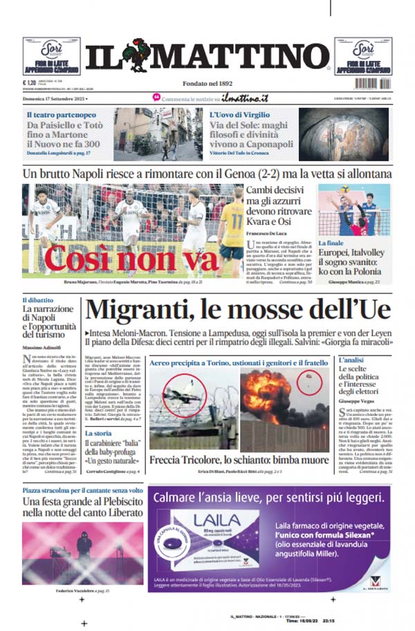 "Così non va. Un brutto Napoli riesce a rimontare col il Genoa", l'edizione odierna de Il Mattino dà spazio al pareggio in trasferta del Napoli, che si allontana ulteriormente dalla vetta ora occupata dall'Inter a punteggio pieno.