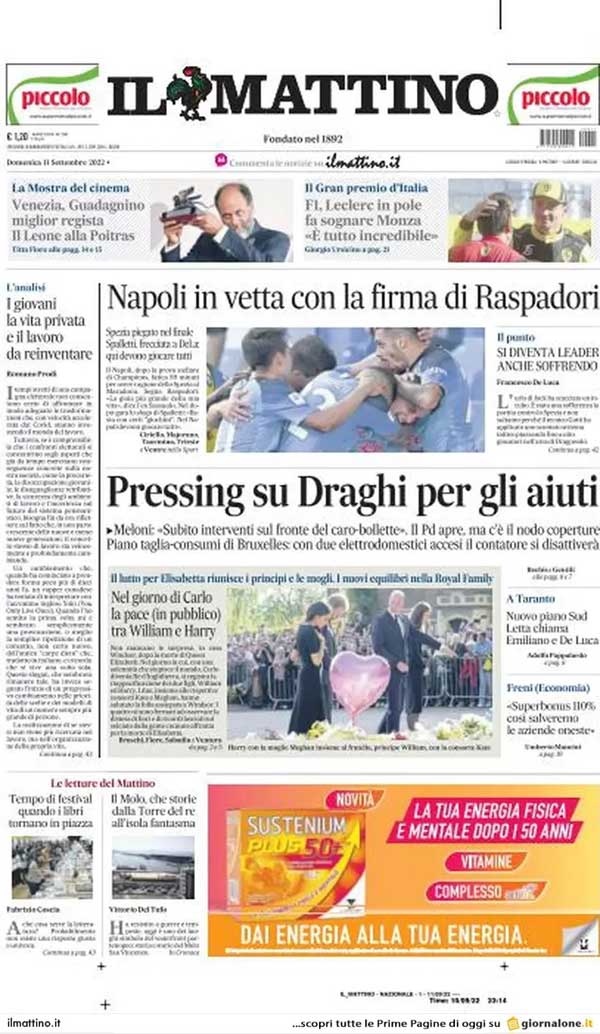 "Il Napoli in vetta con la firma di Raspadori", titola l'edizione odierna de Il Mattino in merito alla vittoria del Napoli contro lo Spezia allo stadio Maradona. Primo gol per l'ex attaccante del Sassuolo.