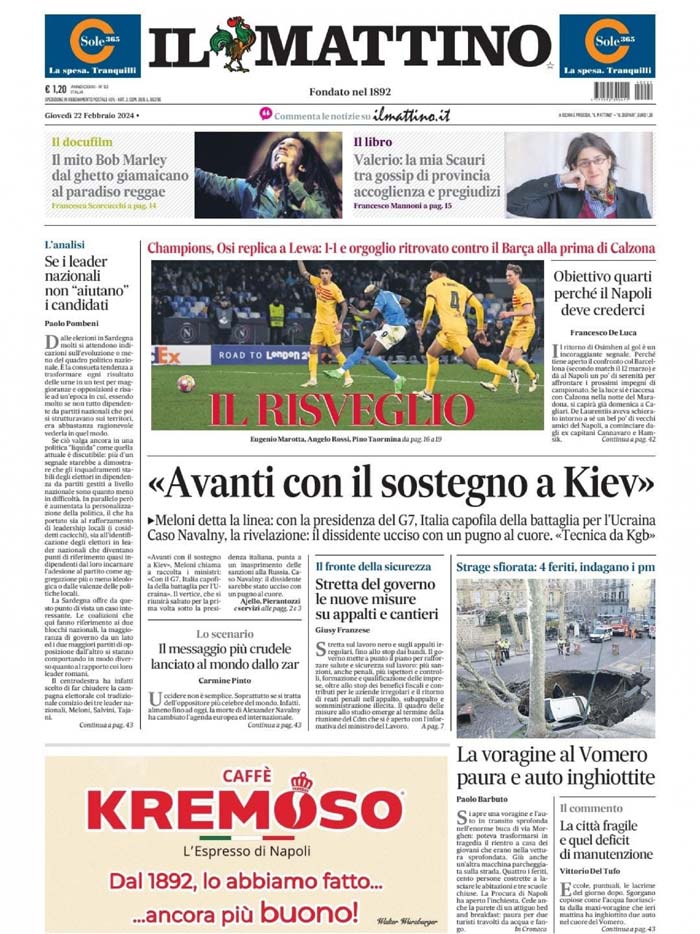 "Il risveglio" è il titolo de Il Mattino dopo il pareggio tra Napoli e Barcellona nel match di andata degli ottavi di finale di Champions League. Quella del Maradona è stata la prima partita alla guida del club azzurro per Francesco Calzona.