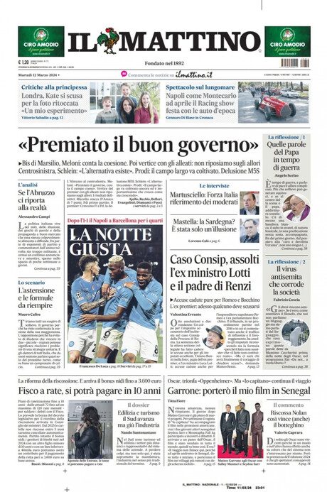 "La notte giusta", titola l'edizione odierna de Il Mattino. Il Napoli di Francesco Calzona scenderà in campo alle 21:00 al Campo Nou contro il Barcellona. Dopo l'1-1 della gara di andata al Maradona, gli azzurri si giocano in casa dei catalani il passaggio ai quarti di finale di Champions League. Poi spazio ai motori: "Napoli come Montecarlo, ad aprile il Racing Show".