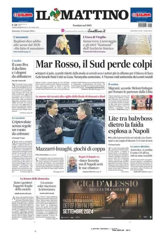 L'edizione odierna de Il Mattino dedica spazio alla finale di Supercoppa italiana tra Inter e Napoli che verrà disputata lunedì, 21 gennaio alle ore 20: "Mazzarri-Inzaghi, giochi di coppa".