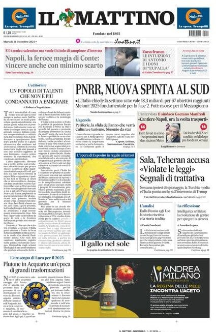 "Napoli, la feroce magia di Conte: vincere anche con minimo scarto", titola l'edizione odierna de Il Mattino in merito ad Antonio Conte che punta al titolo di campione d'inverno.