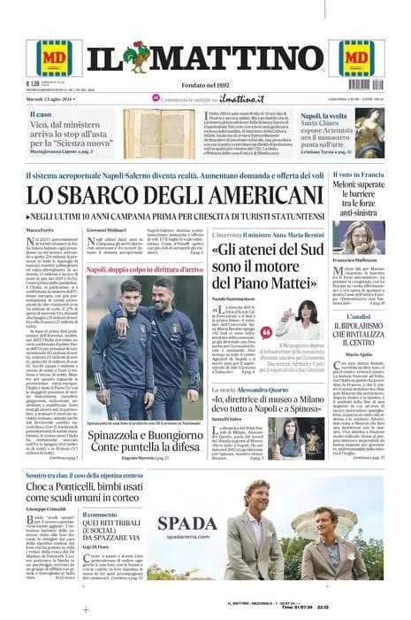 "Spinazzola e Buongiorno: Conte puntella la difesa", titola l'edizione odierna de Il Mattino. Per il Napoli in arrivo un doppio importante colpo in difesa. I due giocatori sono vicinissimi.