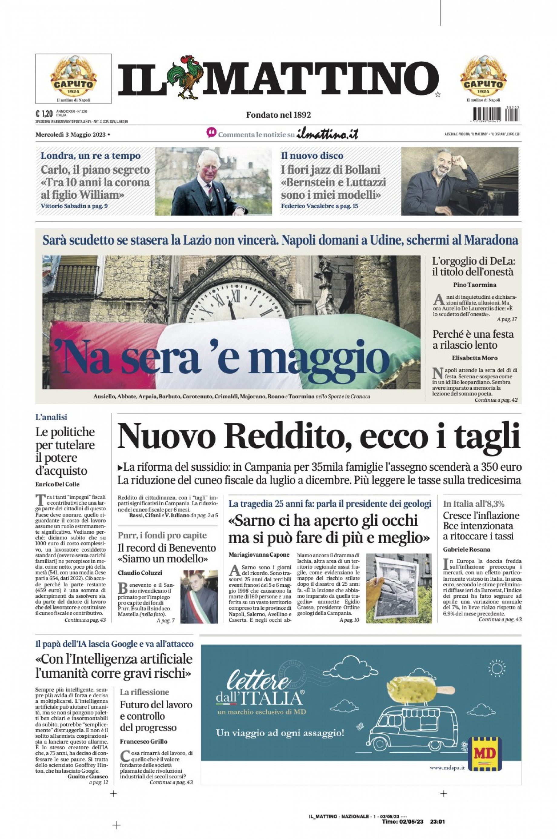 Sono tanti gli spunti che arrivano dalla prima pagina de Il Mattino. Il noto quotidiano si sofferma su alcuni degli argomenti più caldi del momento. Ecco alcuni titoli dell'ultima edizione: "'Na sera 'e maggio. Sarà Scudetto se stasera la Lazio non vincerà Napoli domani a Udinese, schermi al Maradona. L'orgoglio di DLea: il titolo dell'onestà". E ancora: "Perché è una festa a rilascio lento".