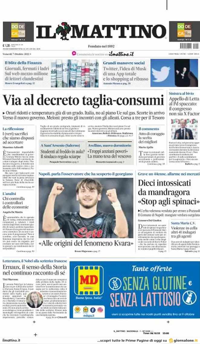 Sono tanti gli spunti che arrivano dalla prima pagina de Il Mattino. Il noto quotidiano si sofferma su alcuni degli argomenti più caldi del momento. Ecco alcuni titoli dell'ultima edizione: "Alle origini del fenomeno Kvara. Napoli, parla l'osservatore che ha scoperto il georgiano", si legge in merito allo sport.