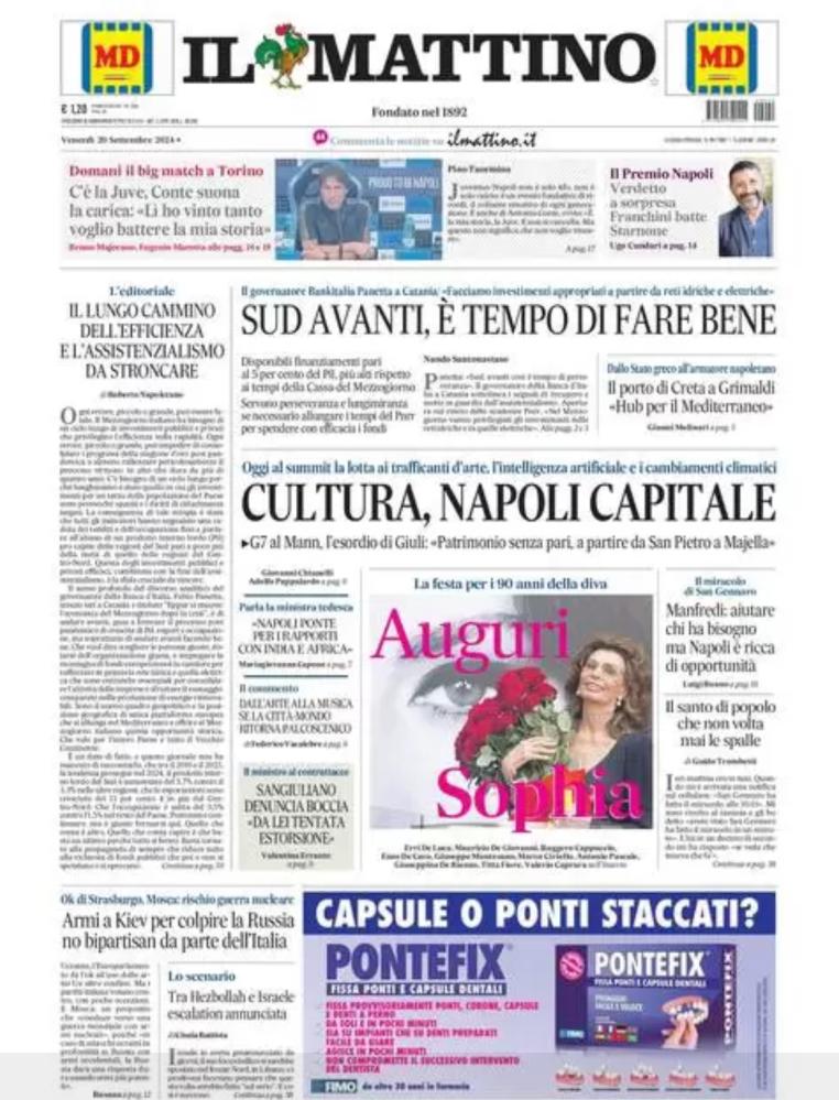 Sono tanti gli spunti che arrivano dalla prima pagina de Il Mattino. Il noto quotidiano si sofferma su alcuni degli argomenti più caldi del momento. Ecco alcuni titoli dell'ultima edizione: "C'è la Juve, Conte suona la caria: 'Lì ho vinto tanto, voglio battere la mia storia'..." si legge nello spazio dedicato allo sport.