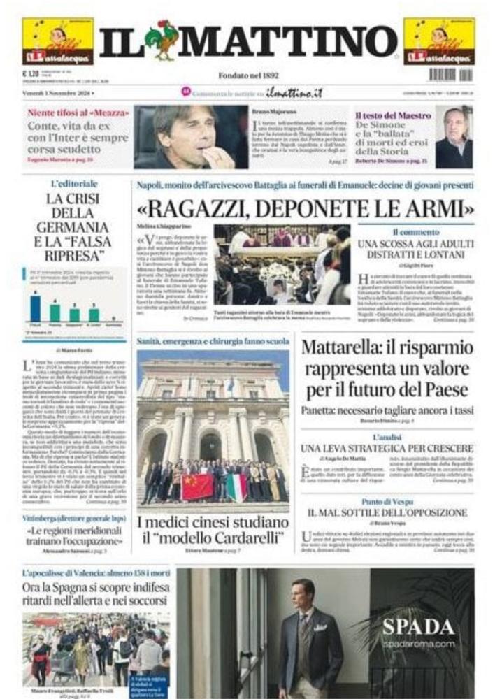 Sono tanti gli spunti che arrivano dalla prima pagina de Il Mattino. Il noto quotidiano si sofferma su alcuni degli argomenti più caldi del momento. Ecco alcuni titoli dell'ultima edizione: "Conte, vita da ex: con l'Inter è sempre corsa Scudetto" si legge nello spazio dedicato allo sport.