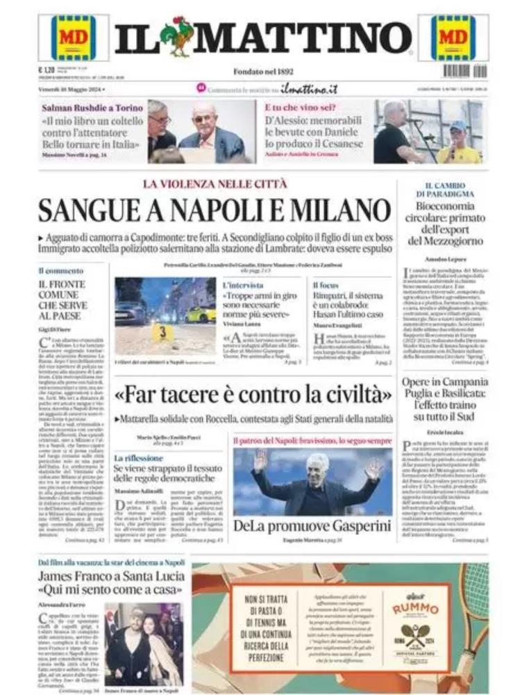 Sono tanti gli spunti che arrivano dalla prima pagina de Il Mattino. Il noto quotidiano si sofferma su alcuni degli argomenti più caldi del momento. Ecco alcuni titoli dell'ultima edizione: "DeLa promuove Gasperini. Il patron del Napoli: bravissimo, lo seguo sempre" si legge nello spazio dedicato allo sport.