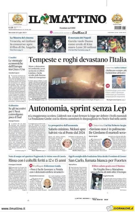 Sono tanti gli spunti che arrivano dalla prima pagina de Il Mattino. Il noto quotidiano si sofferma su alcuni degli argomenti più caldi del momento. Ecco alcuni titoli dell'ultima edizione: "Garcia vuole Danso come erede di Kim, muro Lens: 30 milioni" si legge nel trafiletto dedicato allo sport.