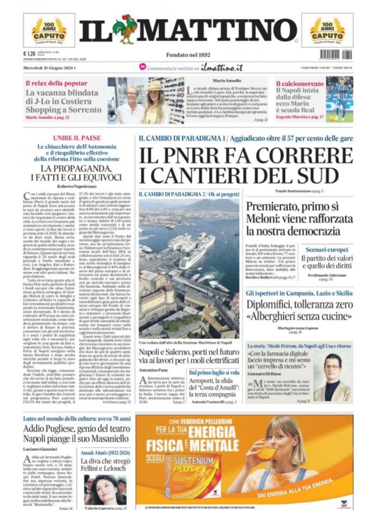 Sono tanti gli spunti che arrivano dalla prima pagina de Il Mattino. Il noto quotidiano si sofferma su alcuni degli argomenti più caldi del momento. Ecco alcuni titoli dell'ultima edizione: "Il Napoli inizia dalla difesa: ecco Marin, è scuola Real" si legge nello spazio dedicato allo sport.