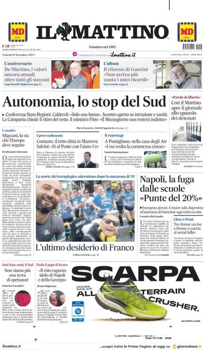 Sono tanti gli spunti che arrivano dalla prima pagina de Il Mattino. Il noto quotidiano si sofferma su alcuni degli argomenti più caldi del momento. Ecco alcuni titoli dell'ultima edizione: "Parla il papà di Kvara: il mio ragazzo idolo di Napoli e della Georgia", si legge in merito allo sport.