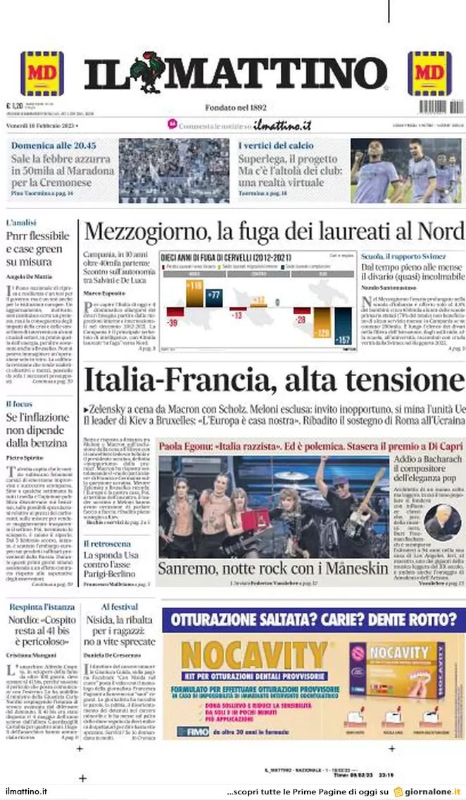 Sono tanti gli spunti che arrivano dalla prima pagina de Il Mattino. Il noto quotidiano si sofferma su alcuni degli argomenti più caldi del momento. Ecco alcuni titoli dell'ultima edizione: "SuperLega, il progetto. Ma c'è l'altolà dei club: una realtà virtuale". E ancora: "Sale la febbre azzurra: in 50 mila al Maradona per la Cremonese", si legge in merito allo sport.