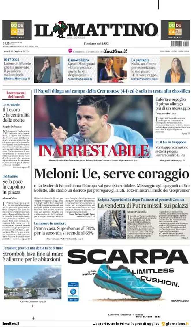 Sono tanti gli spunti che arrivano dalla prima pagina de Il Mattino. Il noto quotidiano si sofferma su alcuni degli argomenti più caldi del momento. Ecco alcuni titoli dell'ultima edizione: "Inarrestabile. Il Napoli dilaga sul campo della Cremonese (4-1) ed è solo in testa alla classifica. Euforia e orgoglio, il primo allungo più di un messaggio", si legge in merito allo sport.