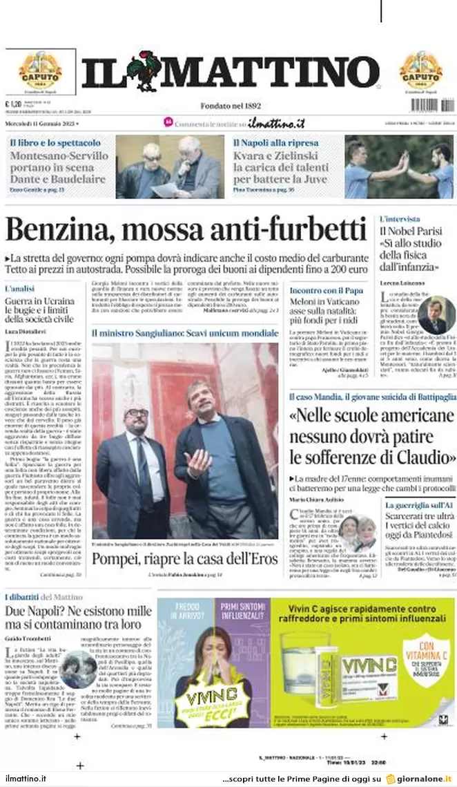 Sono tanti gli spunti che arrivano dalla prima pagina de Il Mattino. Il noto quotidiano si sofferma su alcuni degli argomenti più caldi del momento. Ecco alcuni titoli dell'ultima edizione: "Due Napoli? Ne esistono mille, ma si contaminano tra loro". E ancora: "Il Napoli alla ripresa: Kvara e Zielinski, la carica dei talenti per battere la Juve", si legge in merito allo sport.