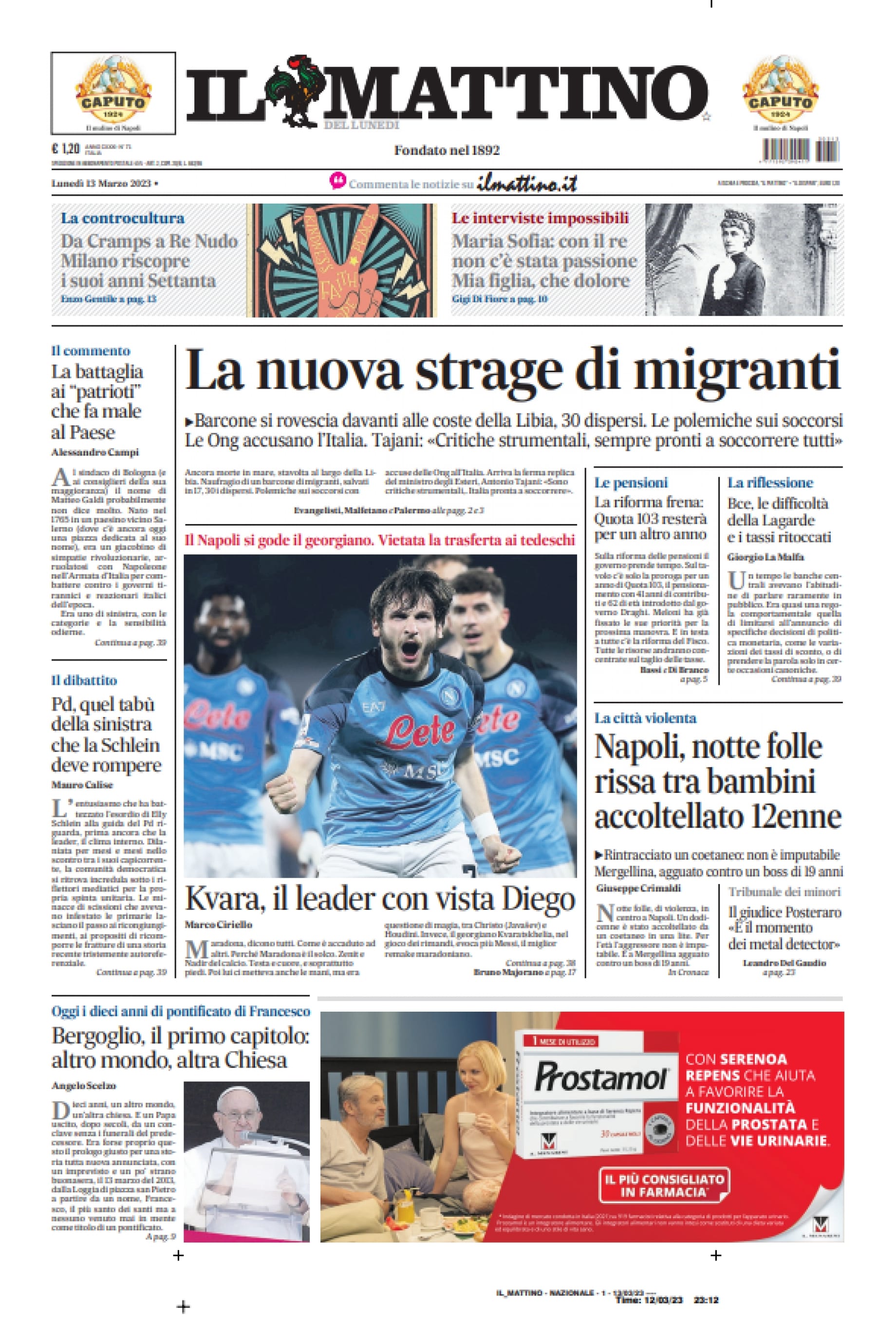Sono tanti gli spunti che arrivano dalla prima pagina de Il Mattino. Il noto quotidiano si sofferma su alcuni degli argomenti più caldi del momento. Ecco alcuni titoli dell'ultima edizione: "Kvara, il leader con vista Diego. Il Napoli si gode il georgiano". E ancora: "Vietata la trasferta ai tedeschi", si legge in merito allo sport.
