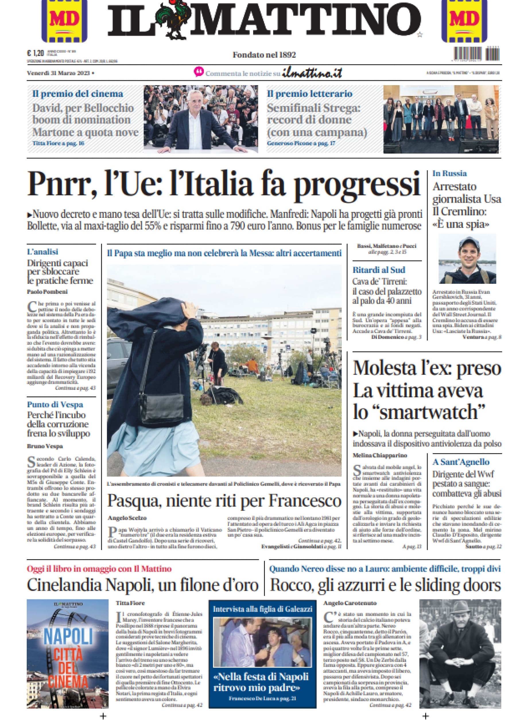 Sono tanti gli spunti che arrivano dalla prima pagina de Il Mattino. Il noto quotidiano si sofferma su alcuni degli argomenti più caldi del momento. Ecco alcuni titoli dell'ultima edizione: "Nella festa di Napoli ritrovo mio padre. Intervista alla figlia di Galeazzi".
