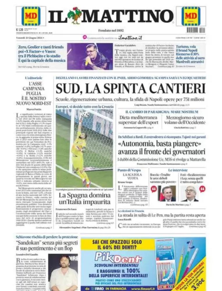 Sono tanti gli spunti che arrivano dalla prima pagina de Il Mattino. Il noto quotidiano si sofferma su alcuni degli argomenti più caldi del momento. Ecco alcuni titoli dell'ultima edizione: "La Spagna domina un'Italia impaurita. Europei, si decide tutto con la Croazia" si legge nello spazio dedicato allo sport.