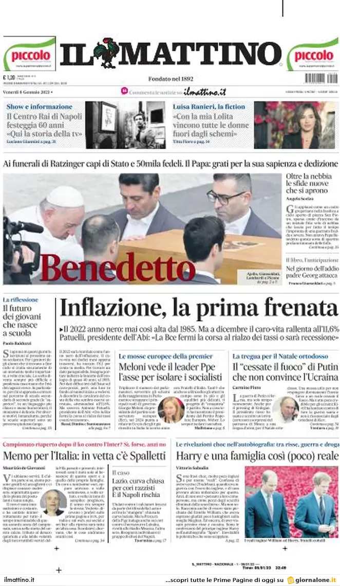 Sono tanti gli spunti che arrivano dalla prima pagina de Il Mattino. Il noto quotidiano si sofferma su alcuni degli argomenti più caldi del momento. Ecco alcuni titoli dell'ultima edizione: "Memo per l'Italia: in vetta c'è Spalletti. Campionato riaperto dopo il KO contro l'Inter? Sì, forze, anzi no". E ancora: "Lazio, curva chiusa per cori razzisti. E il Napoli rischia", si legge in merito allo sport.