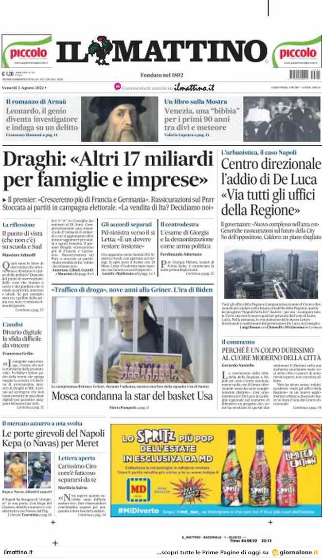 Sono tanti gli spunti che arrivano dalla prima pagina de Il Mattino. Il noto quotidiano si sofferma su alcuni degli argomenti più caldi del momento. Ecco alcuni titoli dell'ultima edizione: "Le porte girevoli del Napoli: Kepa (o Navas) per Meret", si legge in merito allo sport.