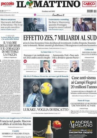 Sulla prima pagina del quotidiano Il Mattino, edizione del 14 dicembre 2024, tra poche ore in edicola, si parla anche della gara tra Udinese e Napoli in programma alle ore 18 ad Udine. Kvaratskhelia è fuori dai giochi per un problema al ginocchio e servono i gol di Romelu.
