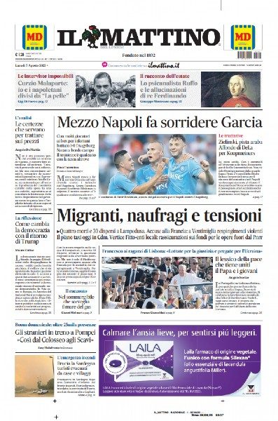 Sono tanti gli spunti che arrivano dalla prima pagina de Il Mattino. Il noto quotidiano si sofferma su alcuni degli argomenti più caldi del momento. Ecco alcuni titoli dell'ultima edizione: "Mezzo Napoli fa sorridere Garcia. Con molti giocatori ai box, battuto l'Augsburg. Natan a bordocampo. Zielinski, pista araba. Affondo di DeLa per Koopmeiners" si legge nel trafiletto dedicato allo sport.