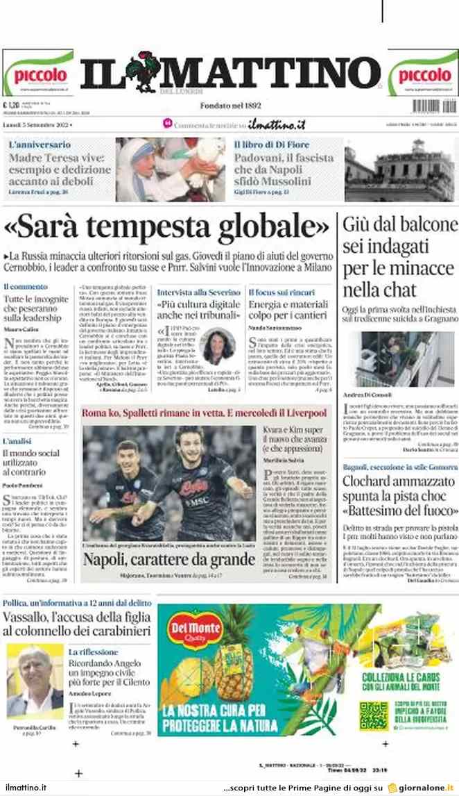 Sono tanti gli spunti che arrivano dalla prima pagina de Il Mattino. Il noto quotidiano si sofferma su alcuni degli argomenti più caldi del momento. Ecco alcuni titoli dell'ultima edizione: "Napoli, carattere da grande. Roma K.O., Spalletti rimane in vetta. E mercoledì il Liverpool", si legge in merito allo sport.