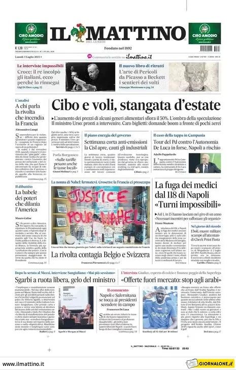 Sono tanti gli spunti che arrivano dalla prima pagina de Il Mattino. Il noto quotidiano si sofferma su alcuni degli argomenti più caldi del momento. Ecco alcuni titoli dell'ultima edizione: "Offerte fuori mercato: stop agli arabi". E ancora: "Napoli e Salernitana, se tocca ai presidenti scendere in campo" si legge nel trafiletto dedicato allo sport.
