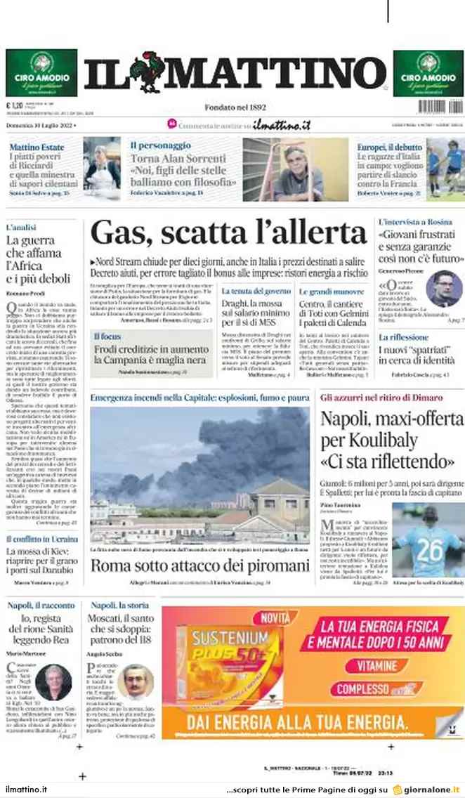 Sono tanti gli spunti che arrivano dalla prima pagina de Il Mattino. Il noto quotidiano si sofferma su alcuni degli argomenti più caldi del momento. Ecco alcuni titoli dell'ultima edizione: "Napoli, maxi-offerta per Koulibaly: ci sta riflettendo. Giuntoli: 6 milioni per 5 anni, poi sarà dirigente", si legge in merito alla politica.