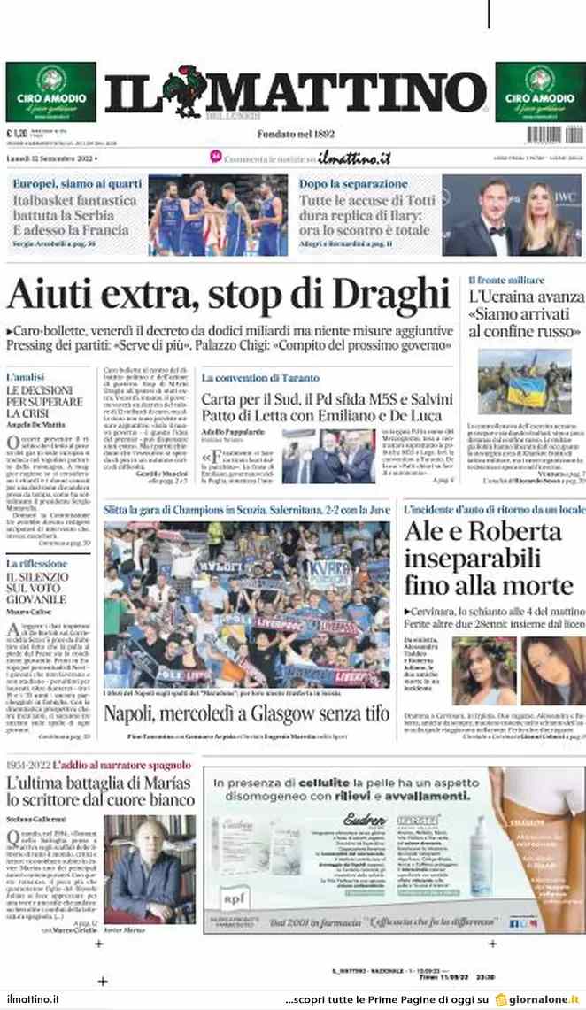 Sono tanti gli spunti che arrivano dalla prima pagina de Il Mattino. Il noto quotidiano si sofferma su alcuni degli argomenti più caldi del momento. Ecco alcuni titoli dell'ultima edizione: "Napoli, mercoledì a Glasgow senza tifo. Slitta la gara di Champions in Scozia", si legge in merito allo sport.