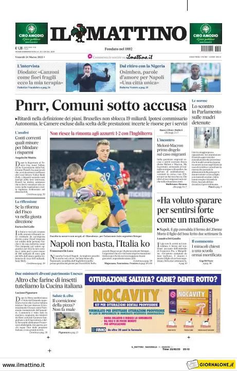PRIMA PAGINA MATTINO - Napoli non basta, Italia KO