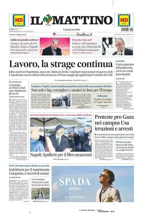 Sono tanti gli spunti che arrivano dalla prima pagina de Il Mattino. Il noto quotidiano si sofferma su alcuni degli argomenti più caldi del momento. Ecco alcuni titoli dell'ultima edizione: "Napoli, Spalletti per il film-amarcord. Ieri sera la prima di 'Sarò con te' a un anno dallo Scudetto" si legge nello spazio dedicato allo sport.